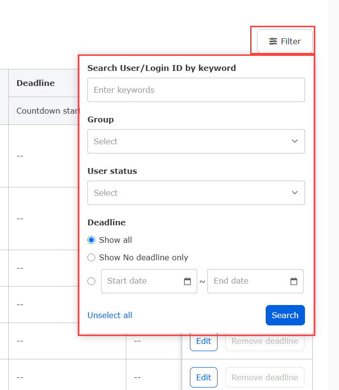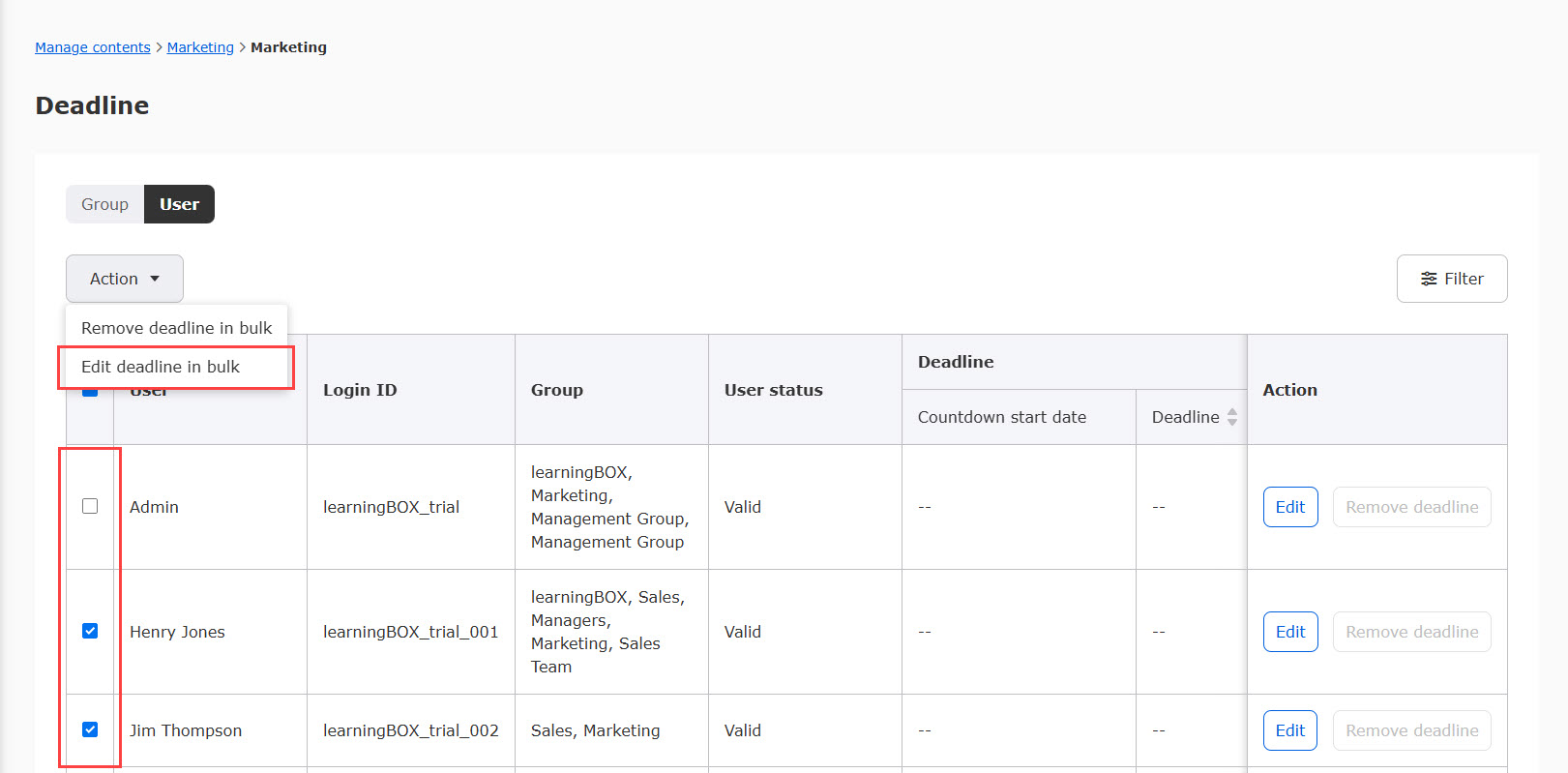Course deadlines set for multiple users can be deleted in a batch.