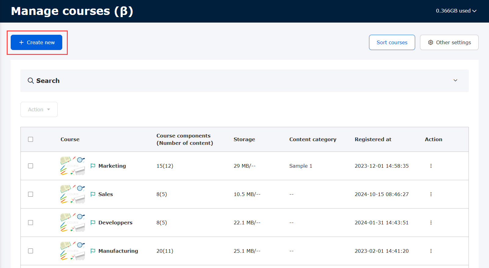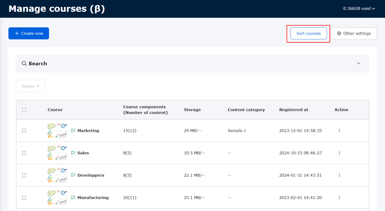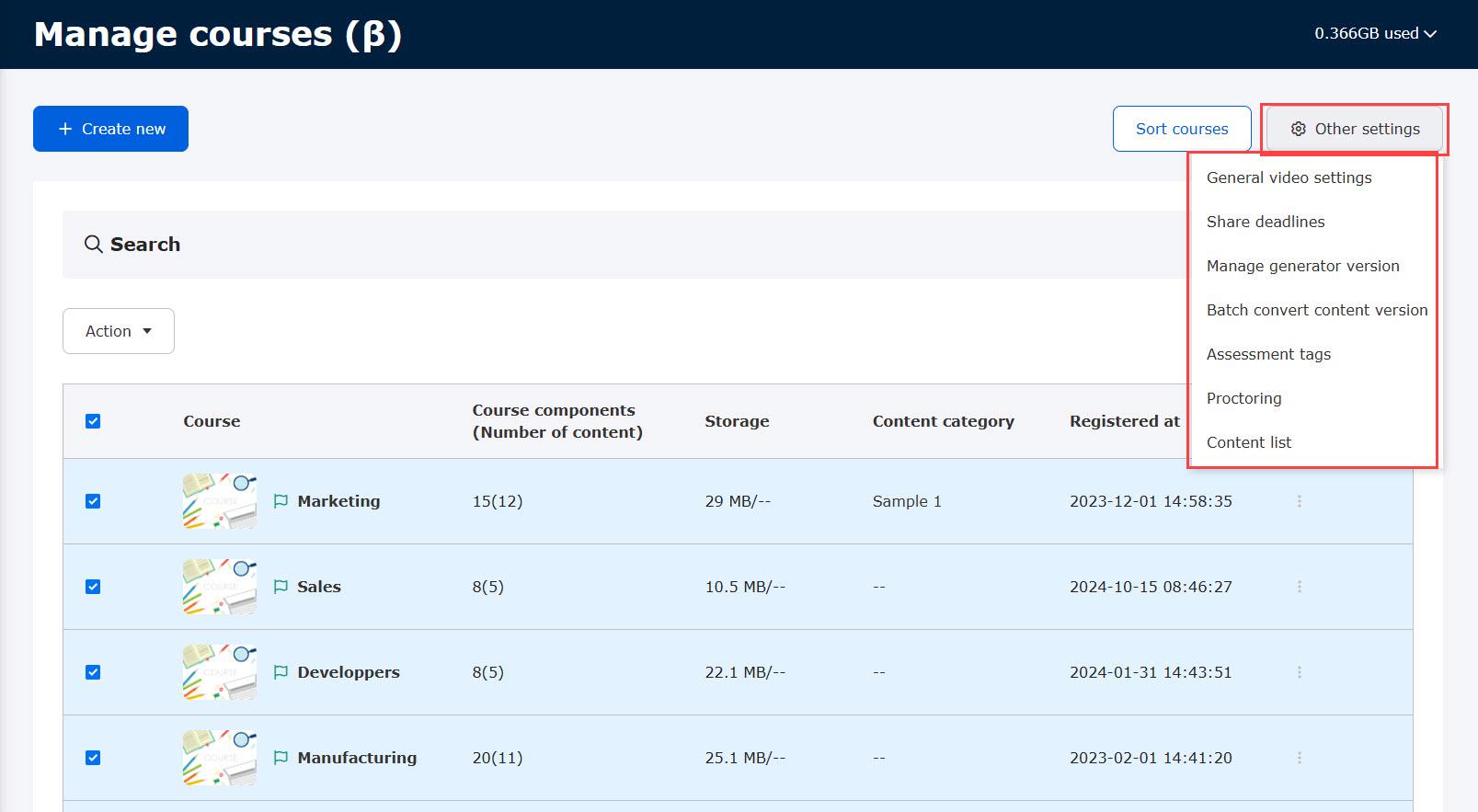 To open the Manage courses, click "Go to Manage courses (β)" or browser back.