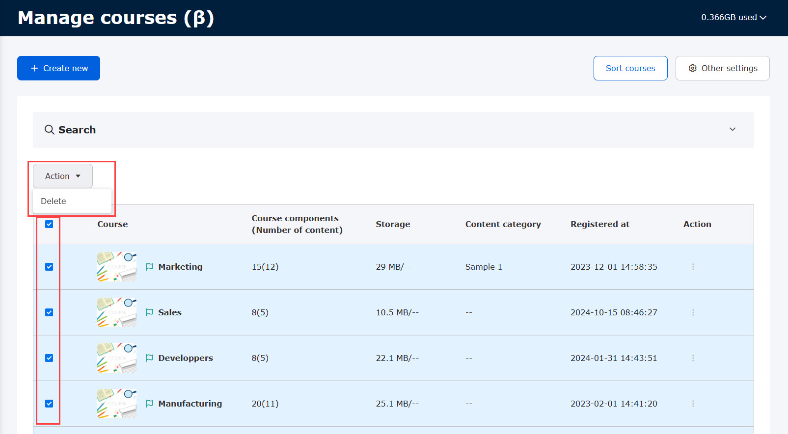Multiple courses can be deleted at once by ticking the boxes and clicking Action > Delete.