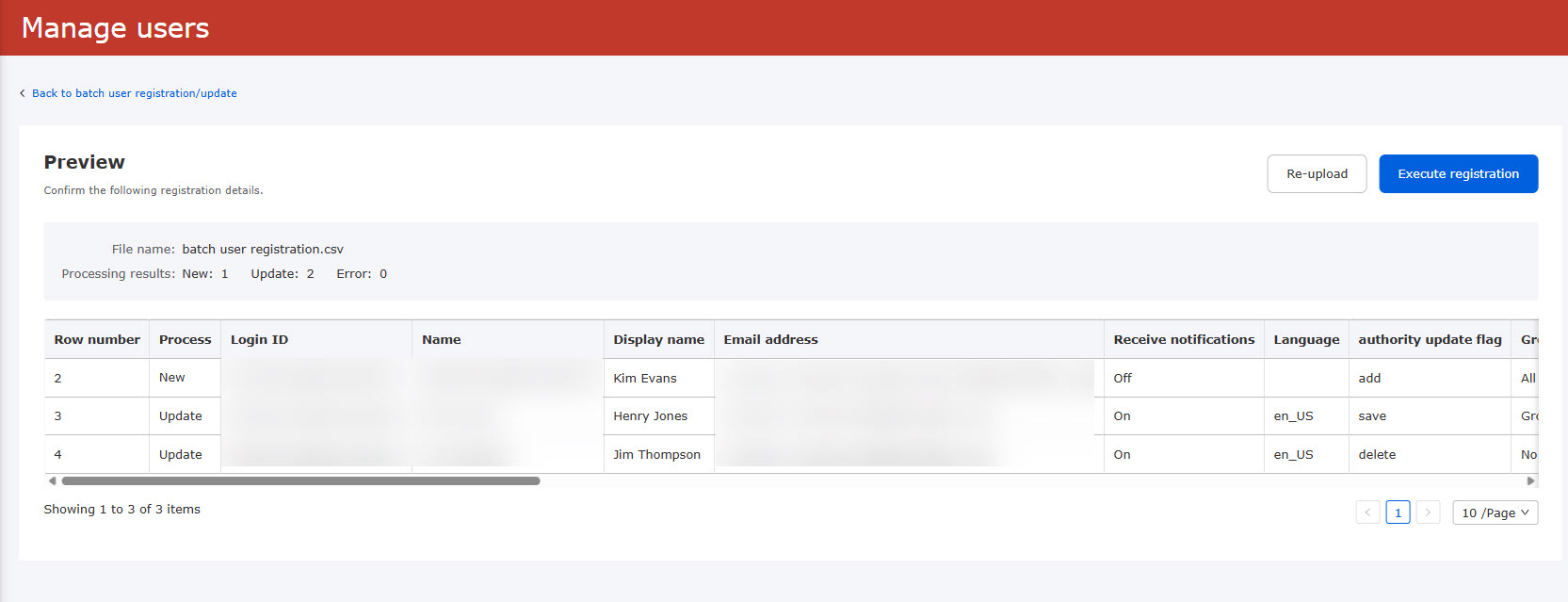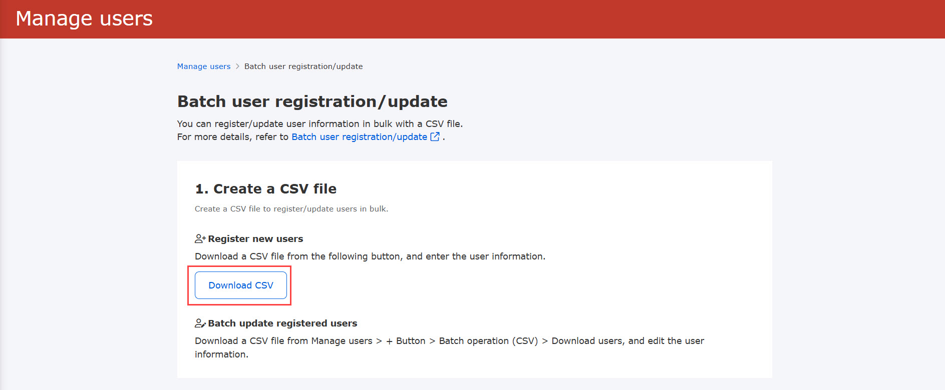 Click the "+" icon on the Manage users page > Batch Operation (CSV) > Batch user registration/update