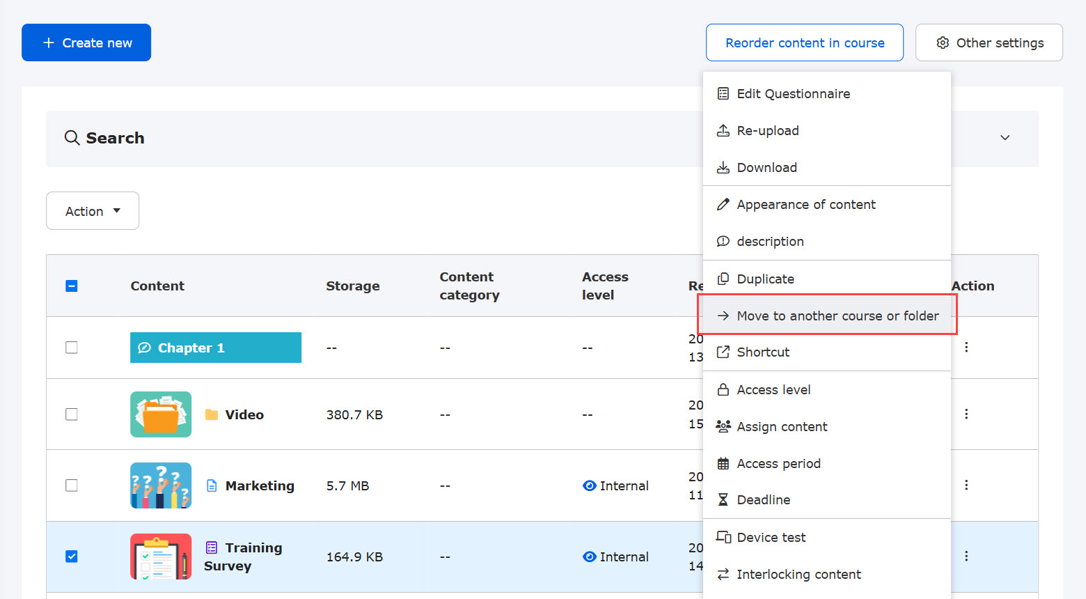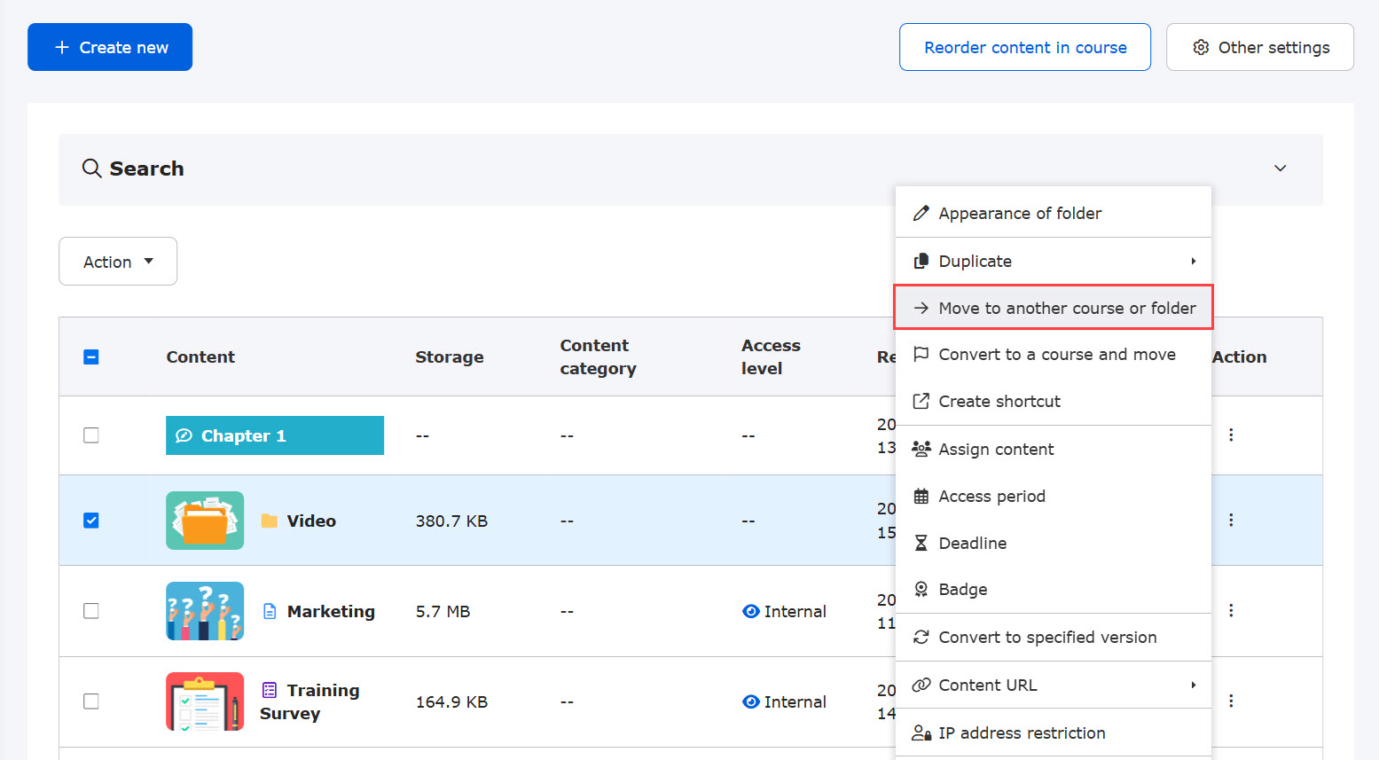 To move content into another course or folder, right-click on the content in question or click on the "︙" icon and select "Move to another course/folder".
