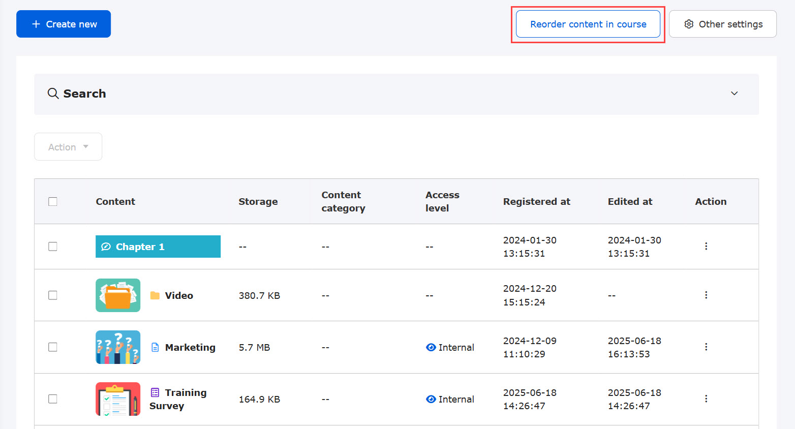To change the order of contents in a course, click "Sort contents in a course" in the upper right corner of the screen.