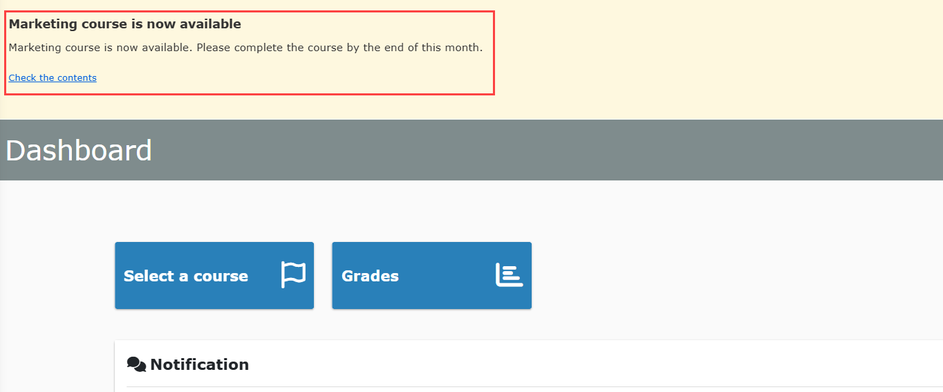 This section explains how the notices you create will appear on the dashboard and in the notification bar.