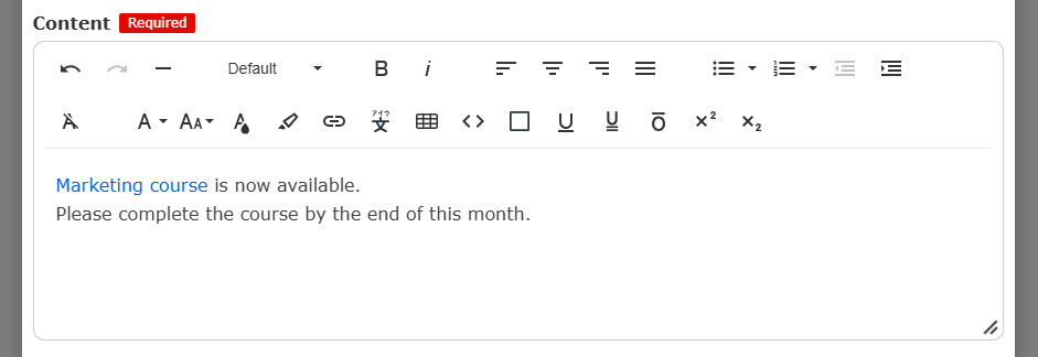 The content can be created in a rich text editor, where you can decorate text, insert tables, links, etc.