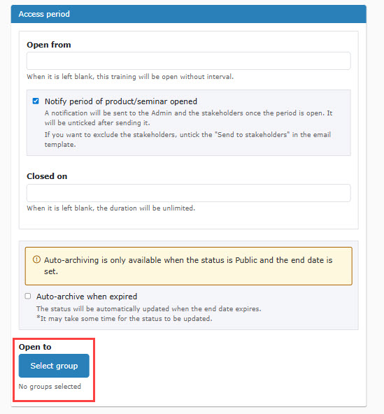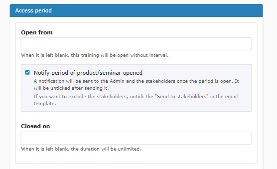 If you tick the "Notify me when product seminars are published" box, the administrator and relevant parties will be notified by e-mail when the product seminar is published.
