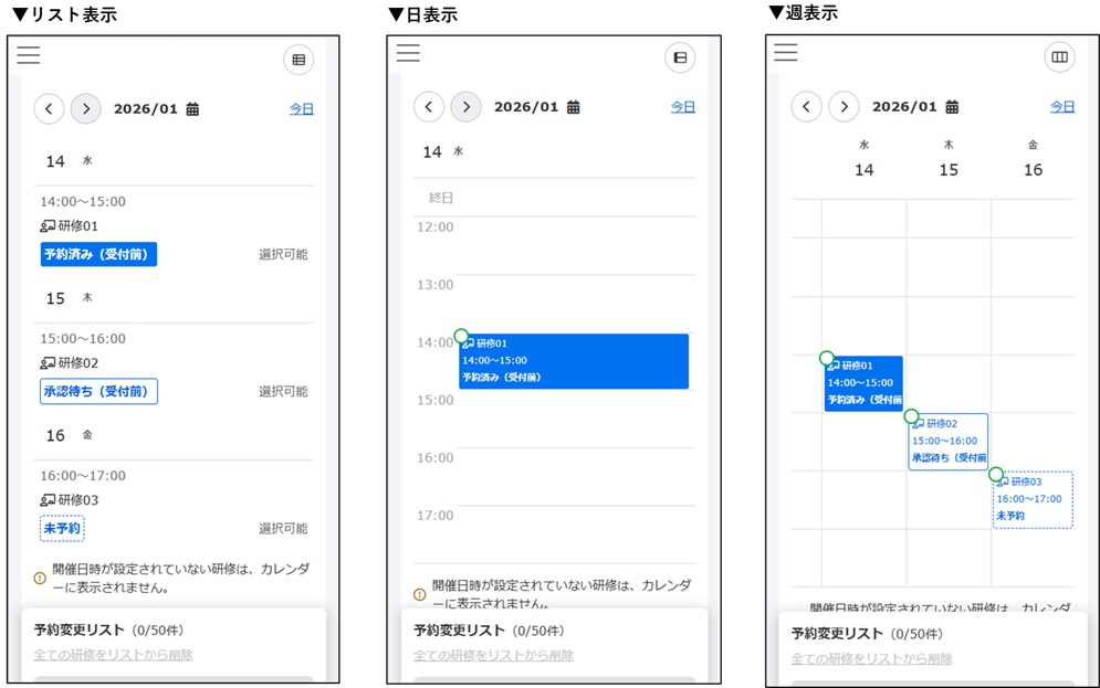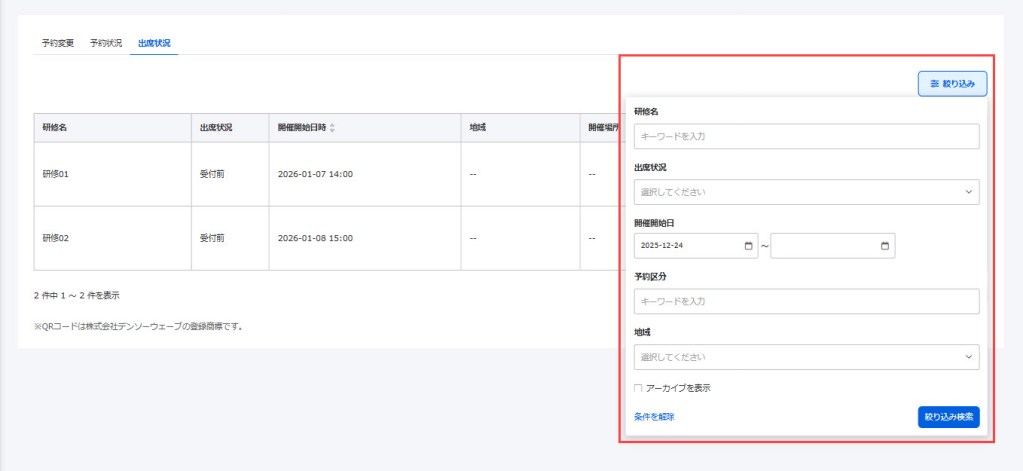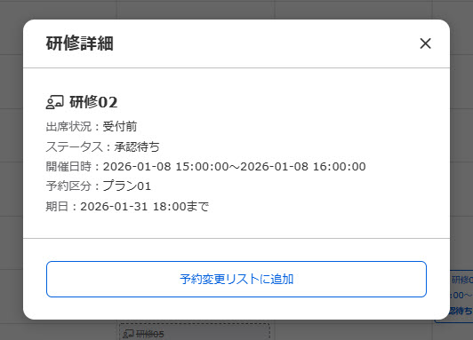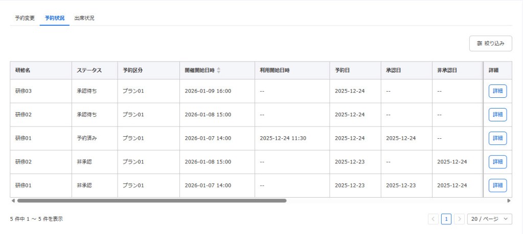 Here, you can check a list of information such as the status of each training course, reservation category, and starting date and time of the event.