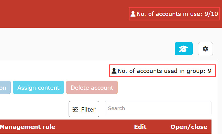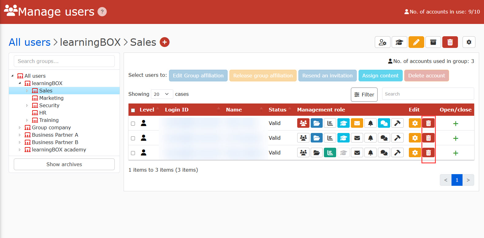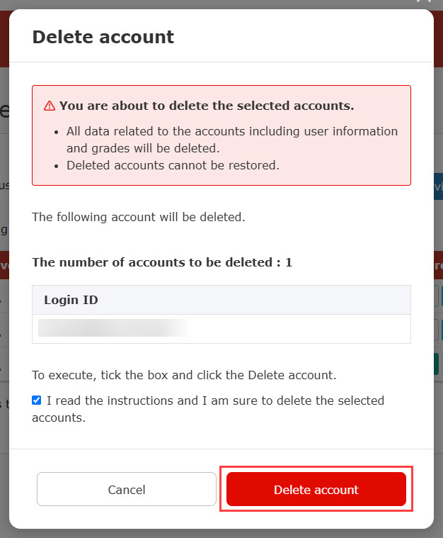 When you delete an account, the login ID and other registered information will be also deleted, and the number of accounts in use will be adjusted immediately.