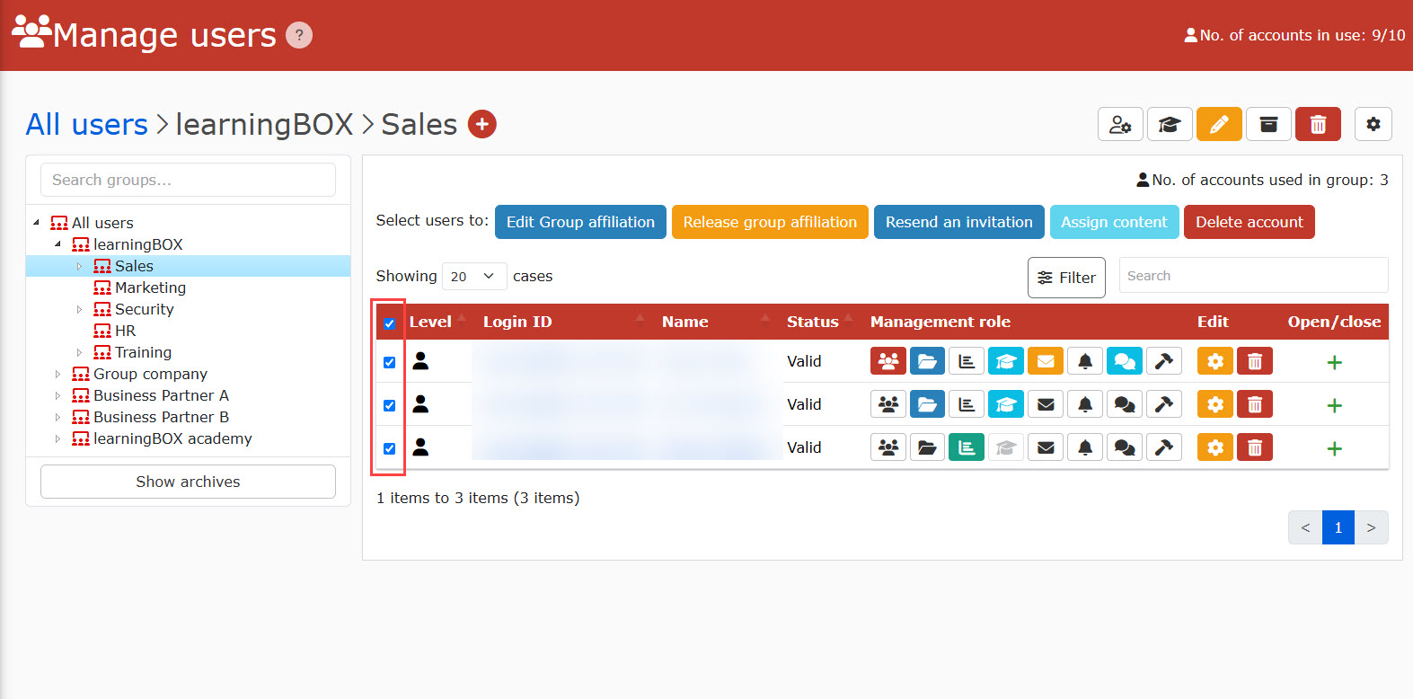 Open the Groups screen by selecting the group to which the target user belongs from the TOP screen of User Management or the Groups list on the left. Tick the user(s) you wish to delete (multiple selections are possible).