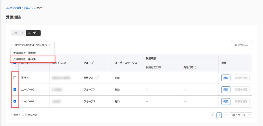 対象のユーザーの左にあるチェックボックスに✔を入れ、「選択中の項目をまとめて操作」>「受講期限を一括編集」を選択してください。