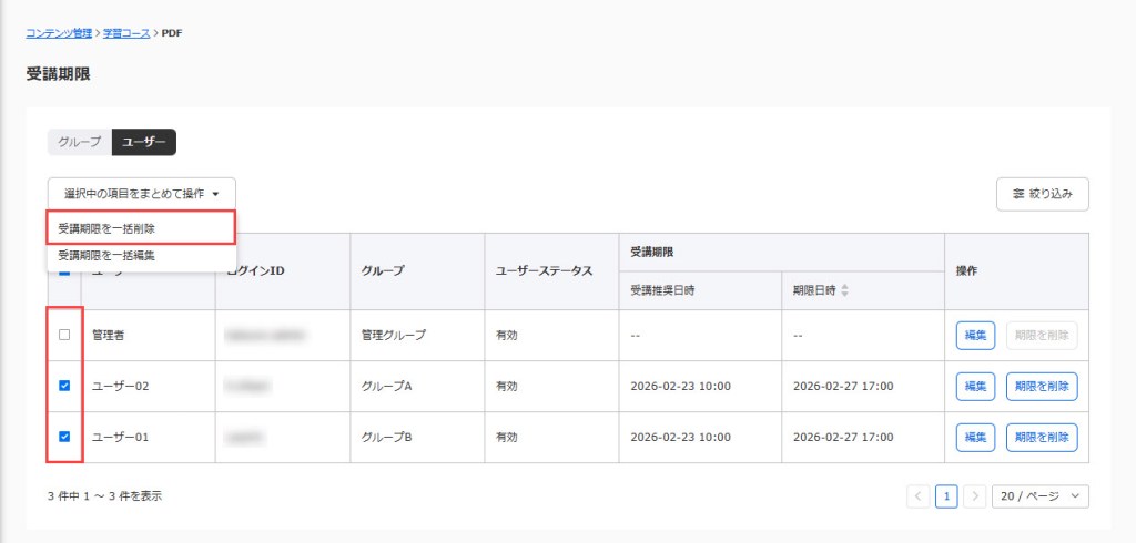 複数のユーザーに対して設定した受講期限を一括で削除できます。