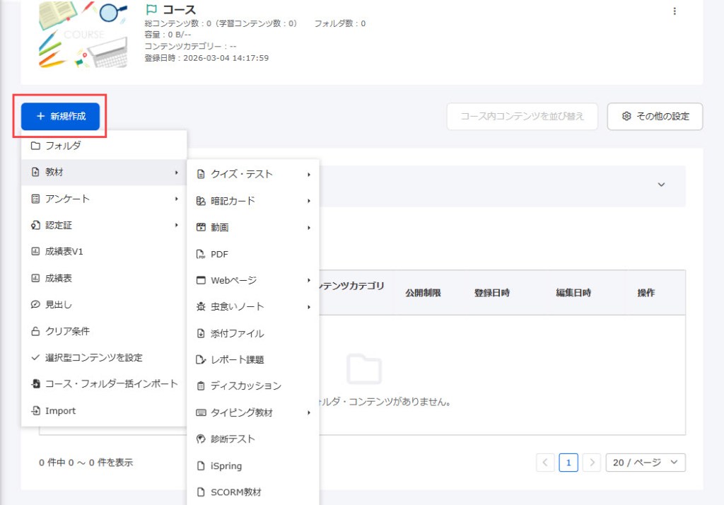 作成したコースをクリックして開き、「+新規作成」から希望するコンテンツを選択して作成してください。