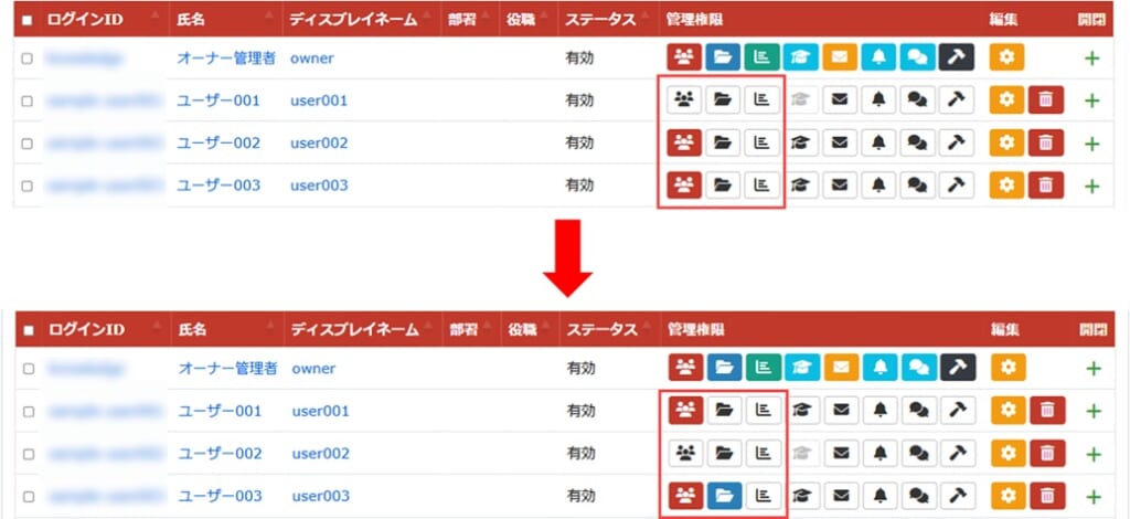 ・ ユーザー003: グループ管理権限 ⇒ グループ管理権限+コンテンツ管理権限