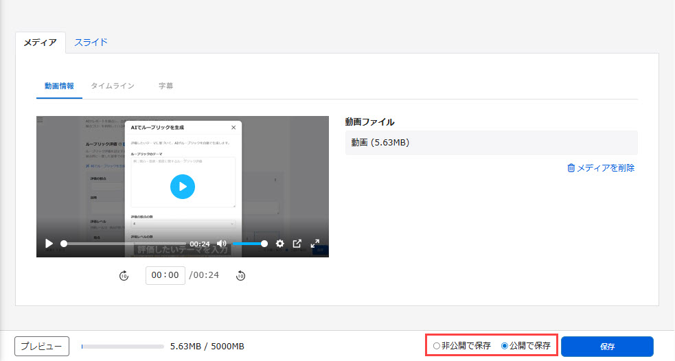 歯車アイコン>「動画・スライドの設定」を選択して開く、「動画作成フォーム」画面で、公開/非公開を設定してください。