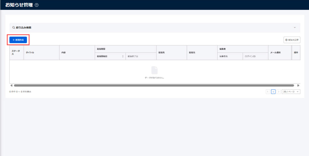 「お知らせ管理」画面の左上にある、「新規登録」をクリックしてください。