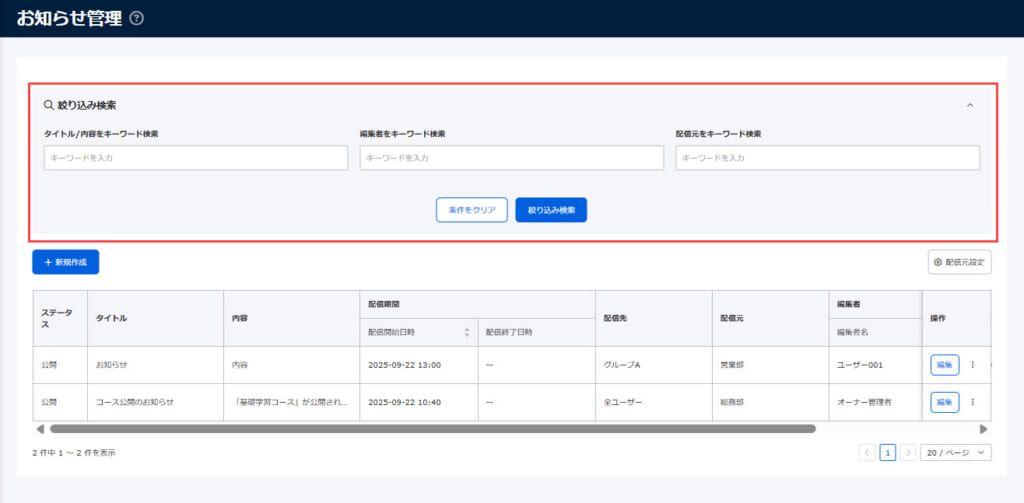 「お知らせ管理」画面の上部にある「絞り込み検索」で、お知らせを検索できます。
