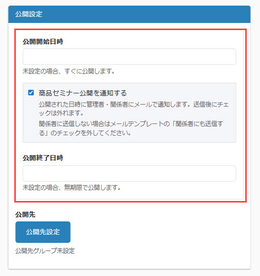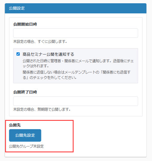 「商品セミナー公開通知」に✔を入れると、公開時に管理者と関係者にメールで通知されます。