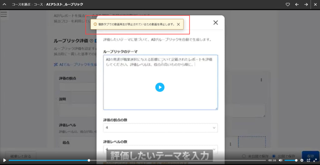 ユーザーがlearningBOX内の複数の動画コンテンツを別タブで開いて同時に再生する、という行為を禁止するように設定できます。