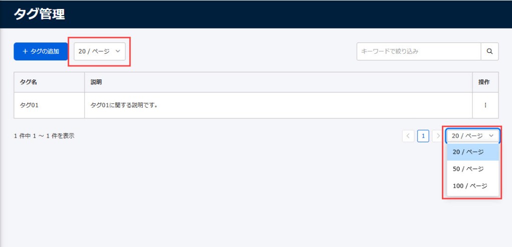 画面上部もしくは下部にあるページネーションで、1ページあたりの表示件数を切り替えできます。