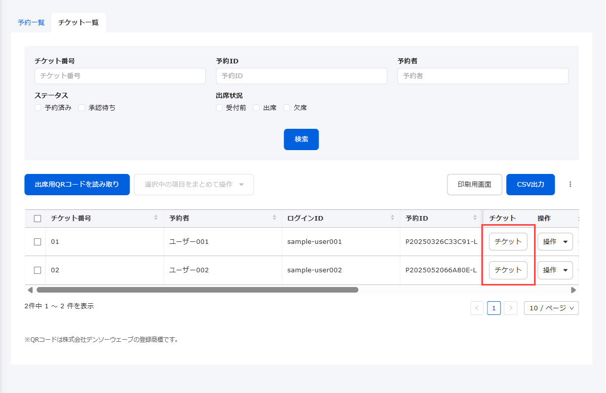 - 予約の管理権限者/出席の管理権限者:チケットのうち、グループ管理編集/閲覧権限の対象ユーザーのみが表示されます