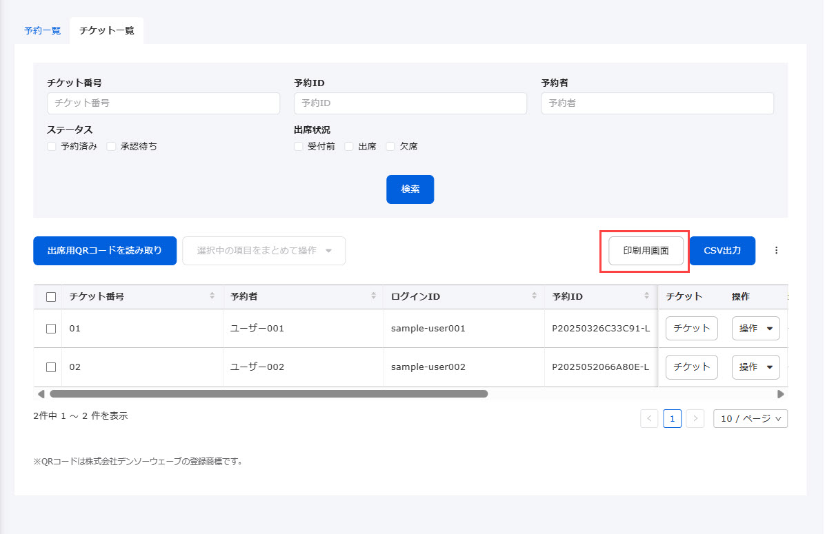まず、「印刷用画面」ボタンをクリックすると、表示しているチケット一覧の印刷前の確認画面が表示されます。