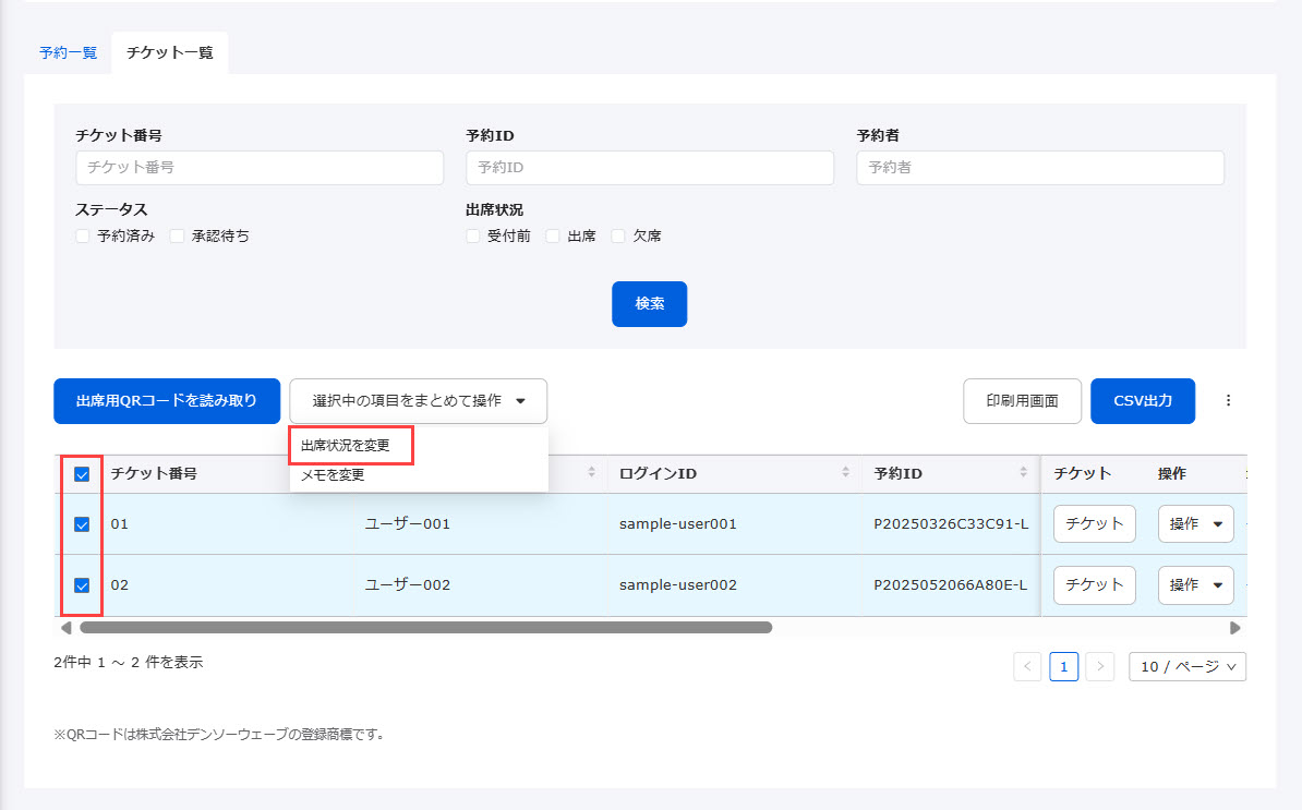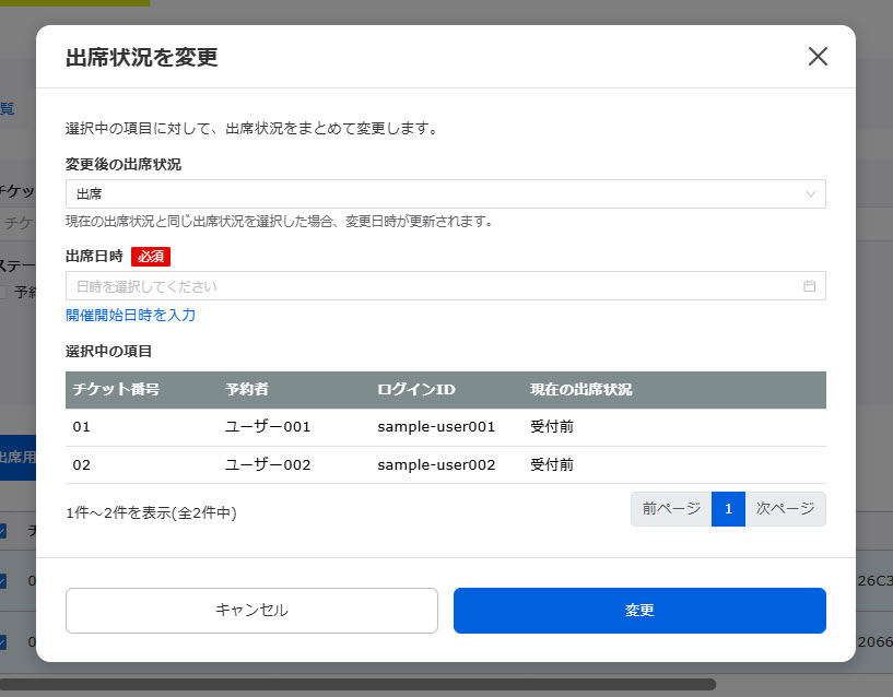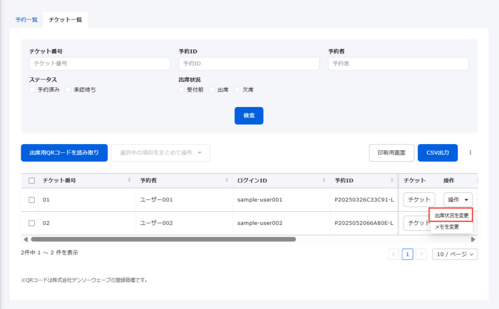 「チケット一覧」画面で、対象のチケットの右にある「操作」をクリックし、「出席状況を変更」を選択します。