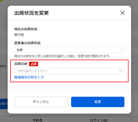 「変更後の出席状況」で「出席」を選択した場合、出席日時をカレンダーから指定してください。