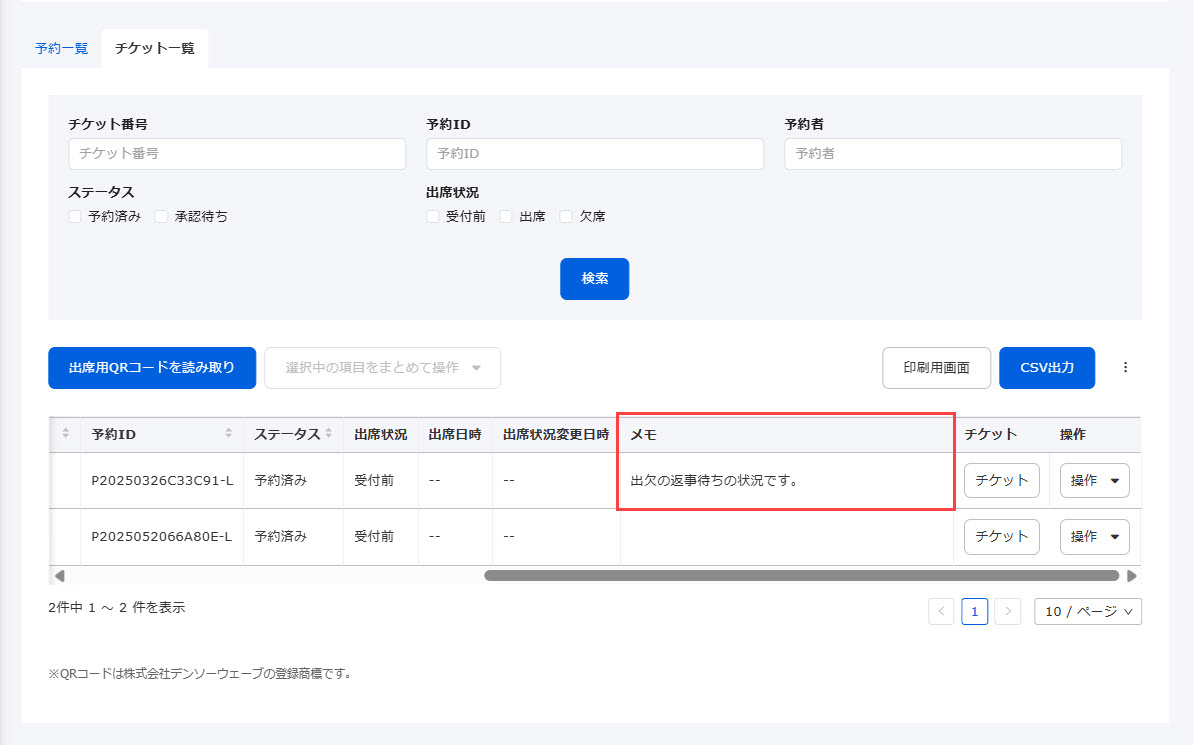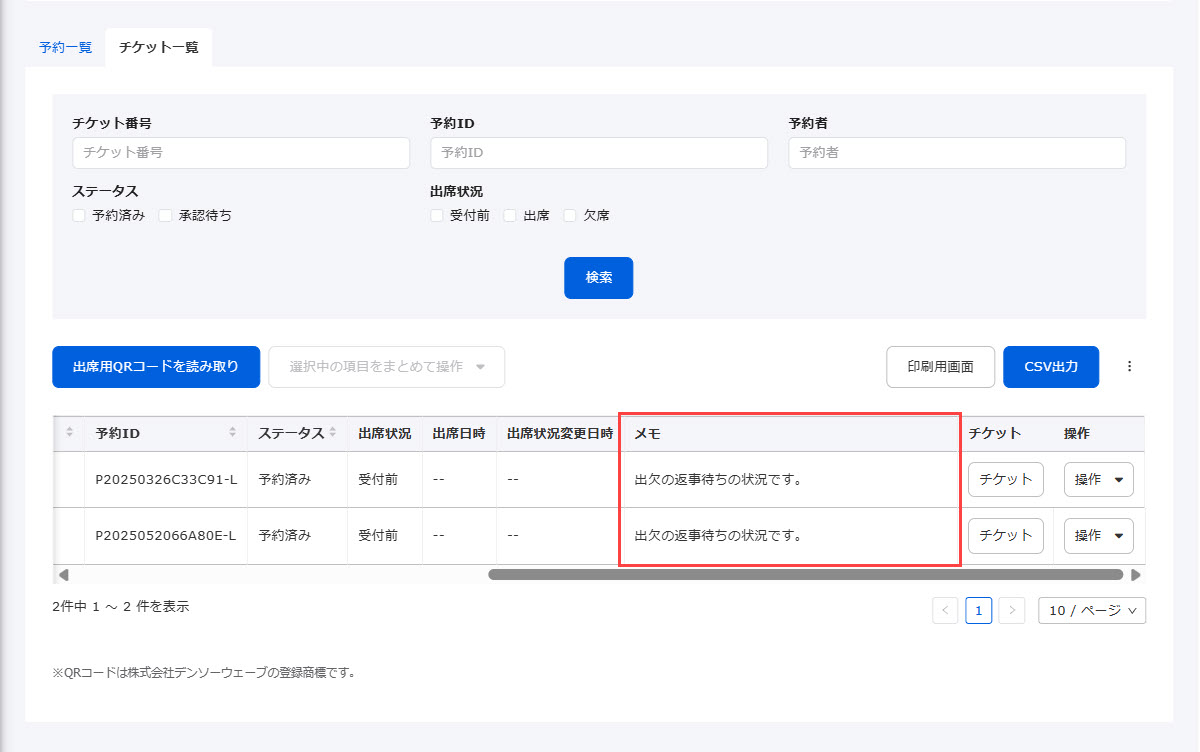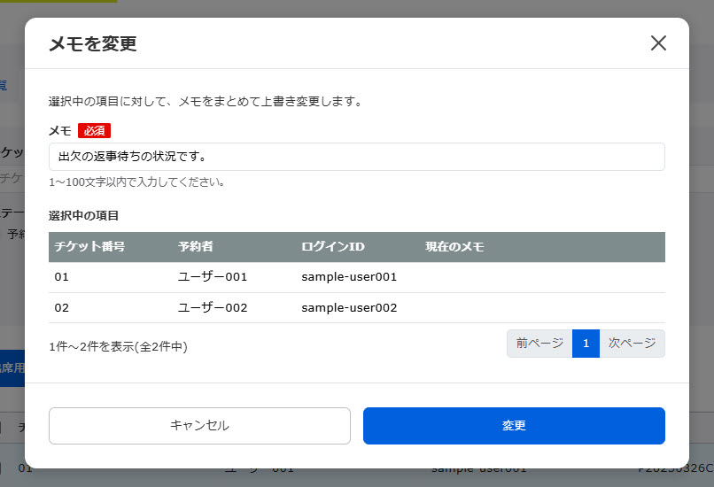 各チケットの右にある「操作」をクリックし、「メモを変更」を選択してください。