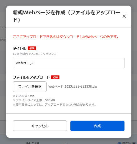 「ファイルを選択」をクリックして、Webページファイルをアップロードしてください。